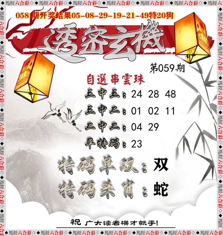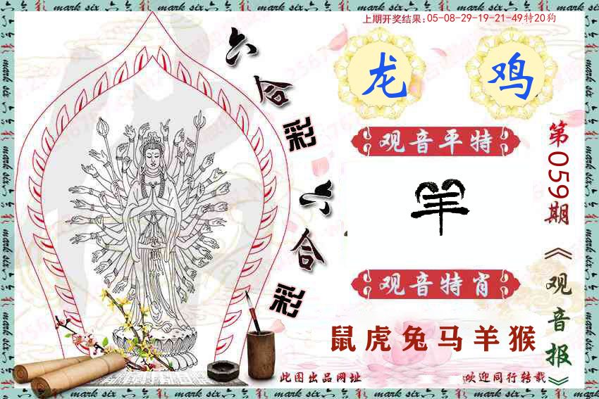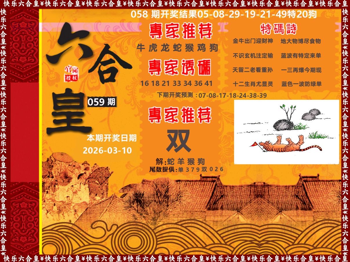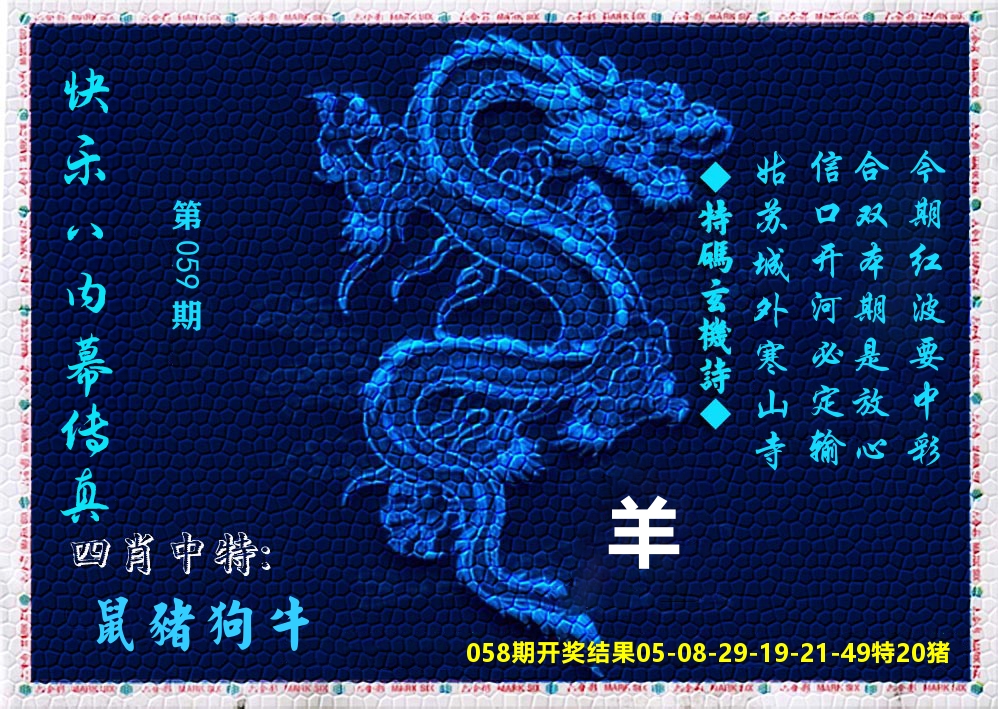 【 零五九九四九零五中本期,猪鸡蛇虎龙开,特为双数 蓝红中。 】 开:兔16准